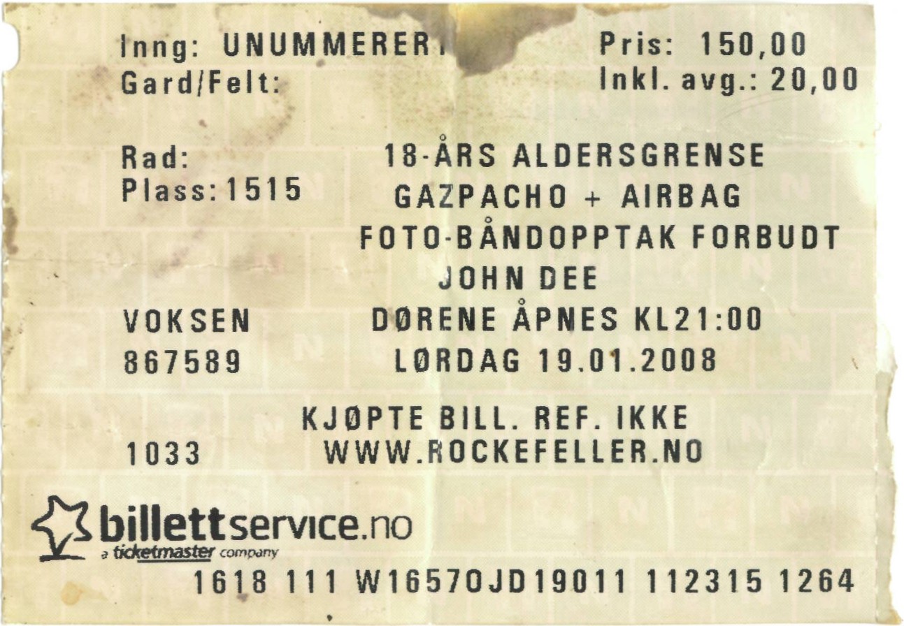 | 19.01.2008 | Gazpacho + Airbag | John Dee | Ticket | jjvdgeer | |||