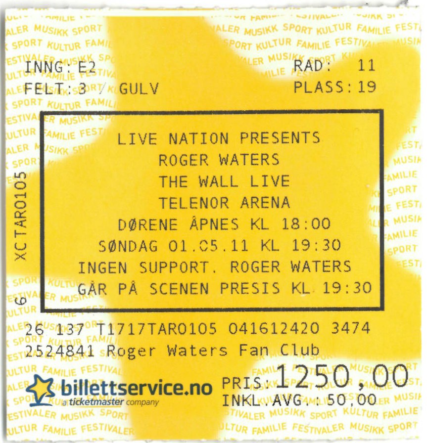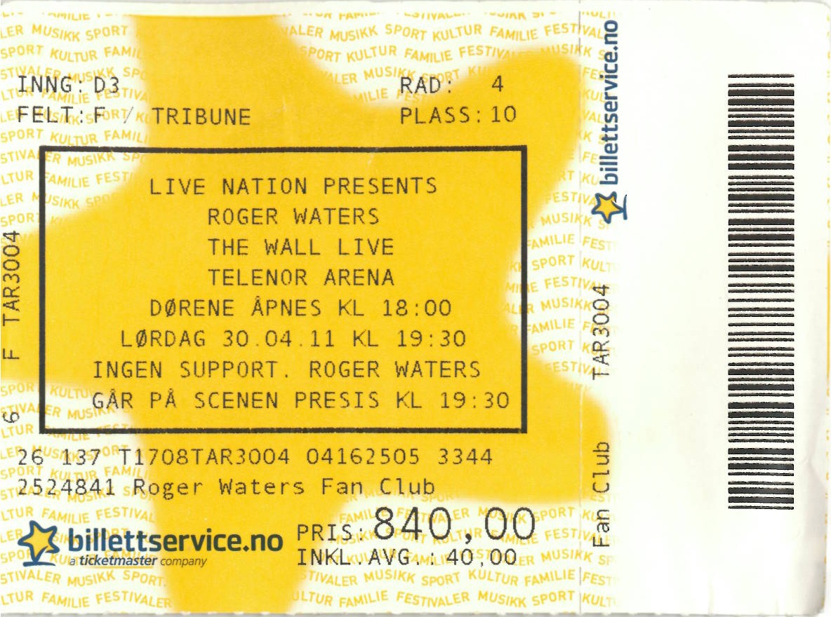| 30.04.2011 | Roger Waters | The Wall Live | Telenor Arena | Ticket | jjvdgeer | ||