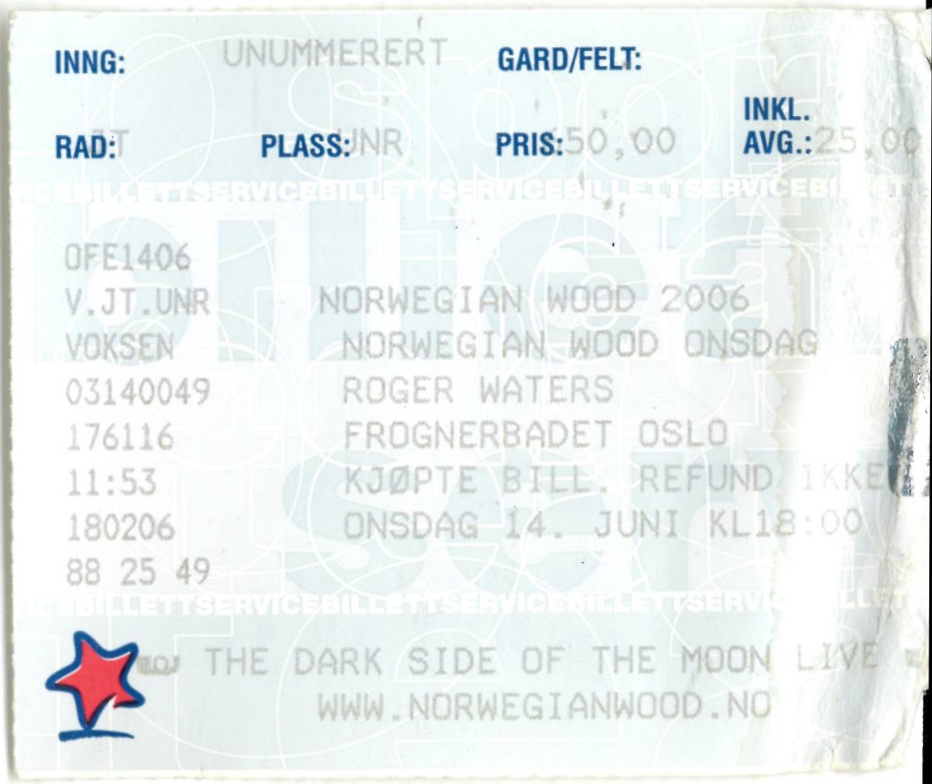 | 14.06.2006 | Roger Waters | The Dark Side of the Moon Live | Frognerbadet | Ticket | jjvdgeer | ||