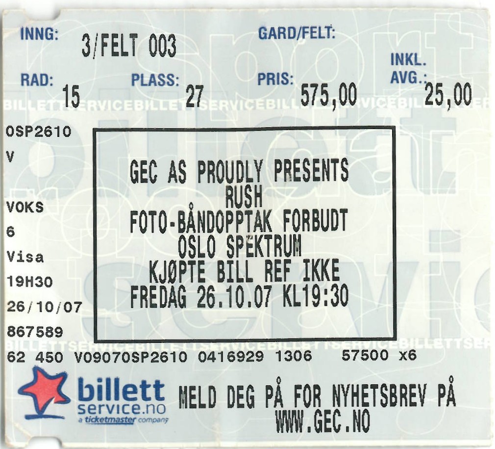 | 26.10.2007 | Rush | Oslo Spektrum | Ticket | jjvdgeer | |||