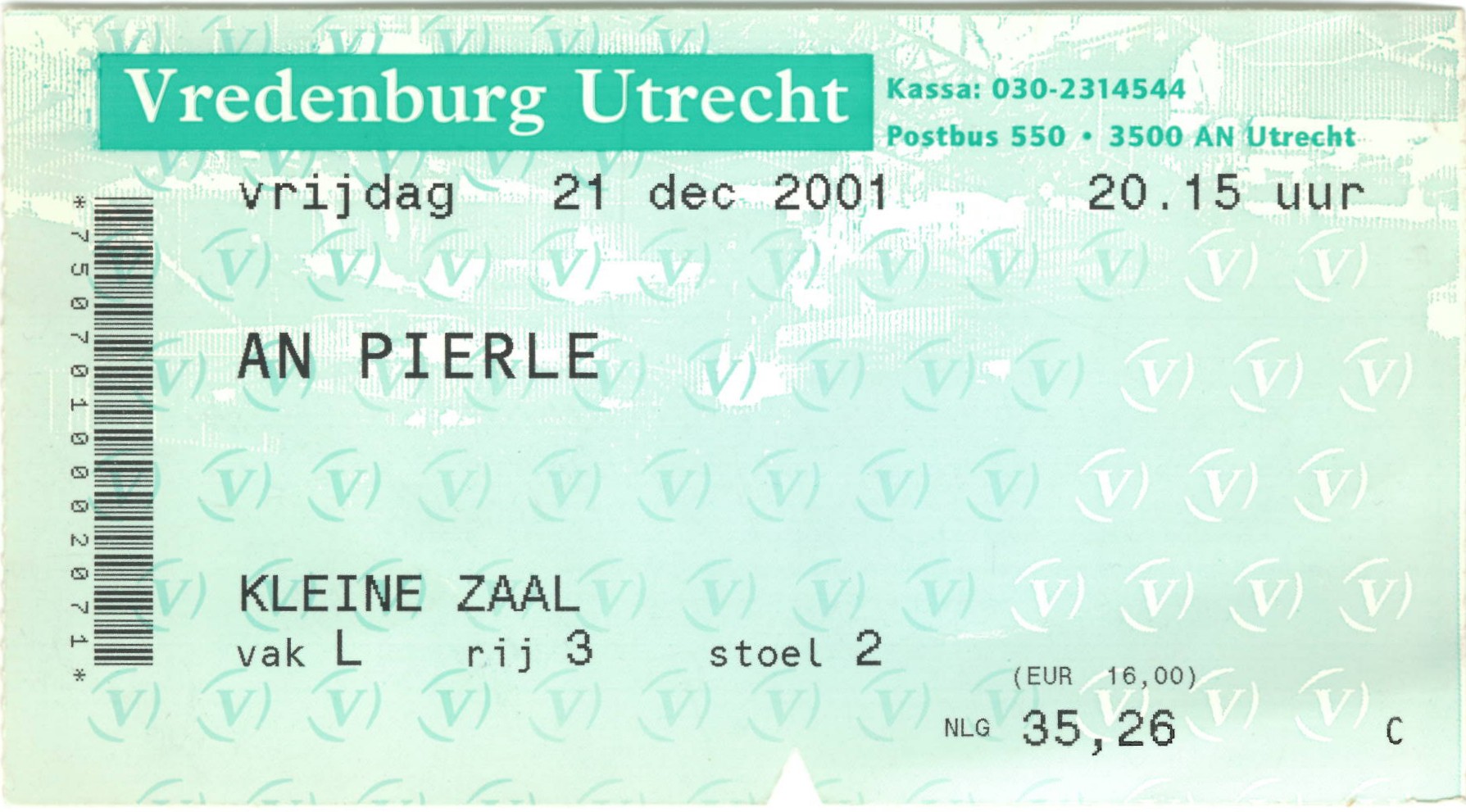 | 21.12.2001 | An Pierlé | Vredenburg Kleine Zaal | Ticket | jjvdgeer |