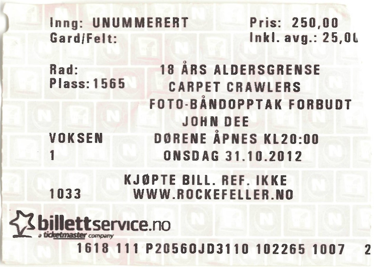 | 31.10.2012 | Carpet Crawlers | John Dee | Ticket | jjvdgeer |