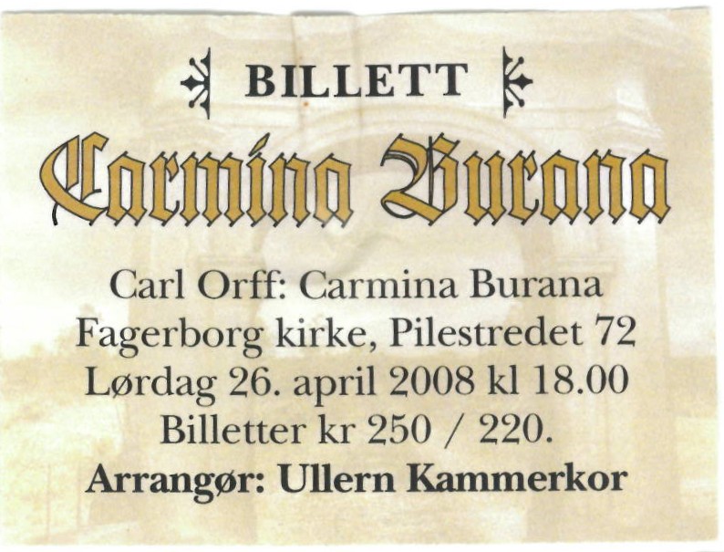 | 26.04.2008 | Ullern Kammerkor | Carmina Burana | Fagerborg Kirke | Ticket | jjvdgeer | ||