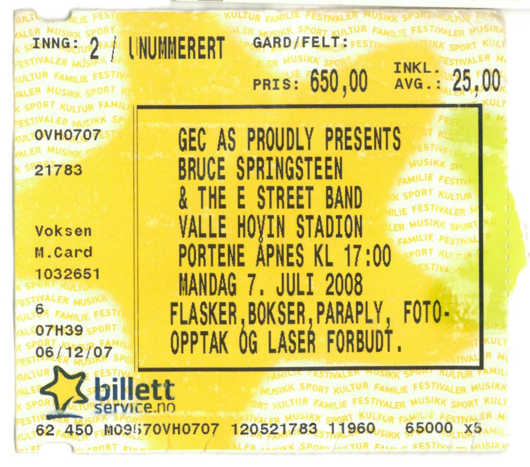 | 07.07.2008 | Bruce Springsteen & The E Street Band | Valle Hovin Stadion | Ticket | jjvdgeer | |||