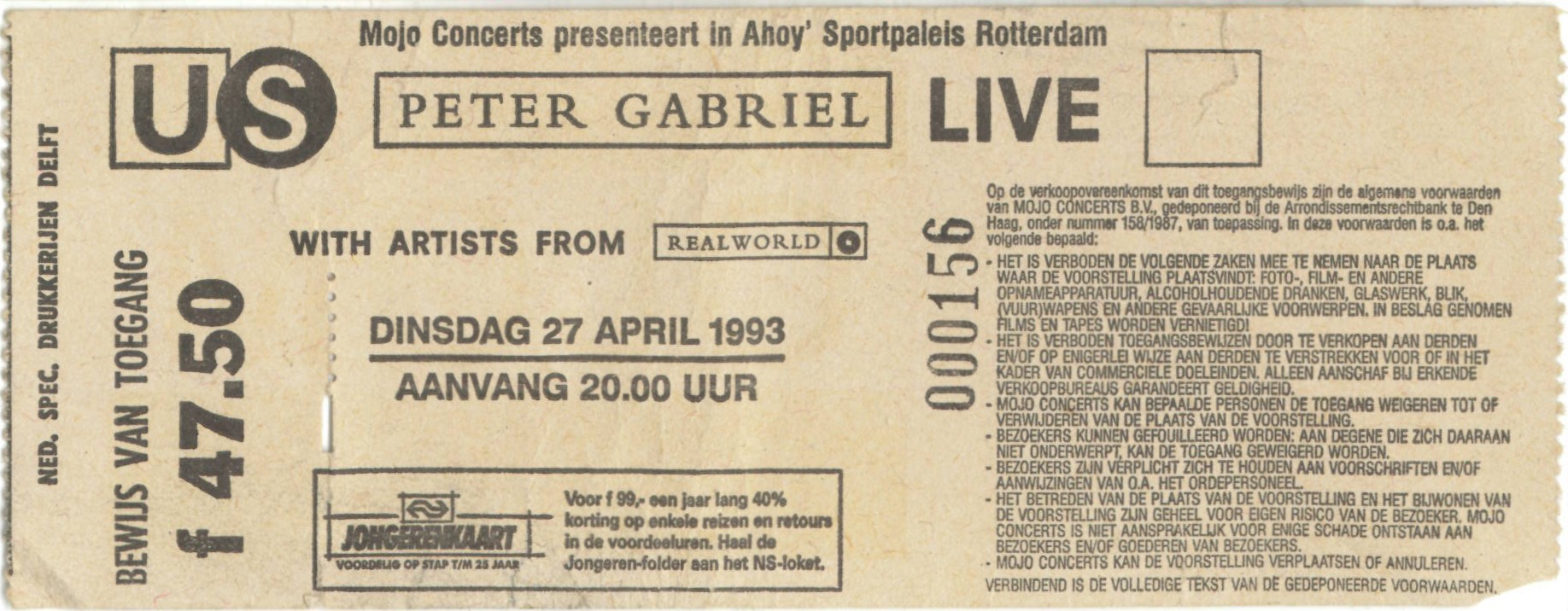| 27.04.1993 | Peter Gabriel | US | Ahoy | Ticket | jjvdgeer | ||