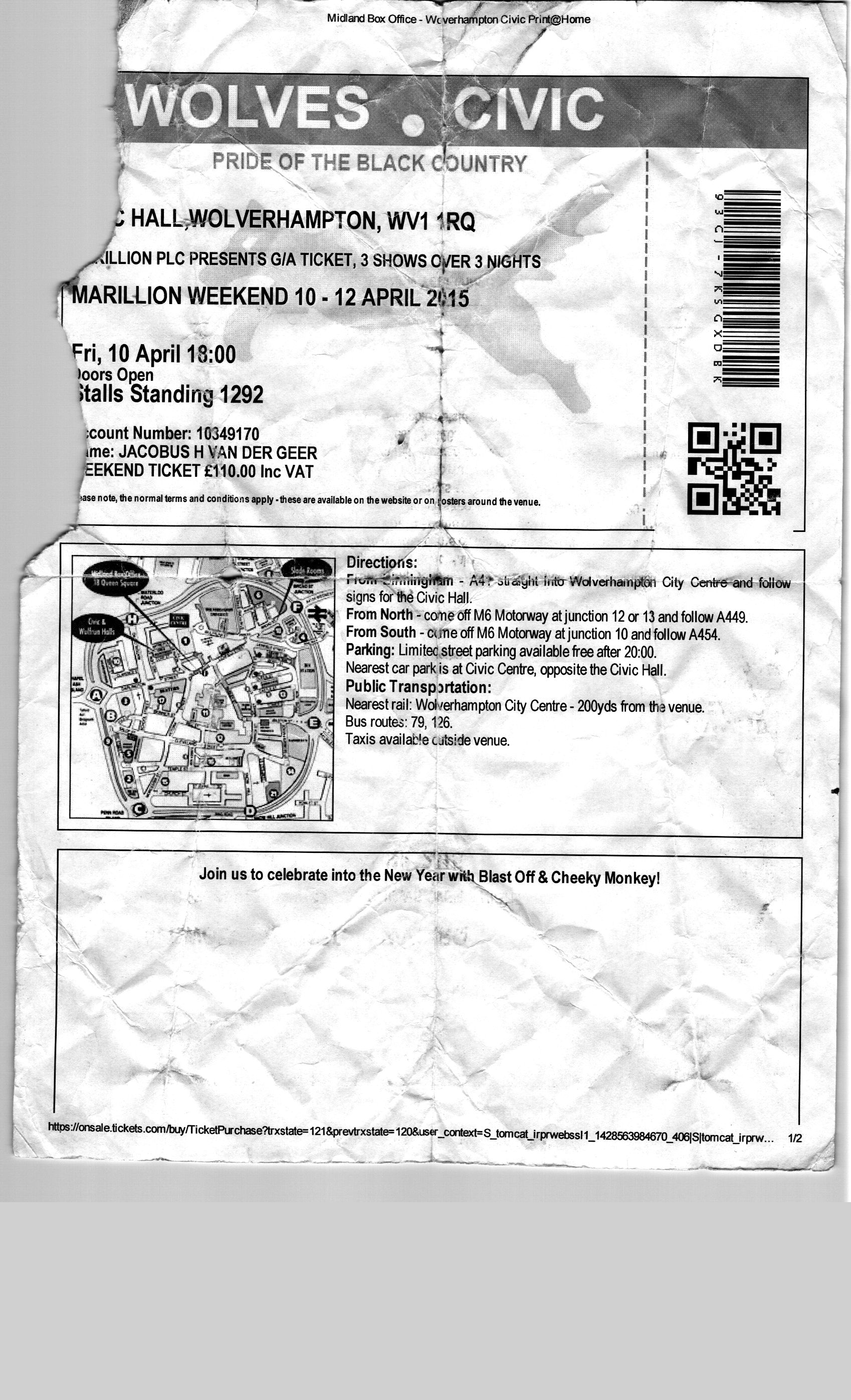 | 10.04.2015 | Marillion | Marillion Weekend: Friday night | Civic Hall | Ticket | jjvdgeer | ||