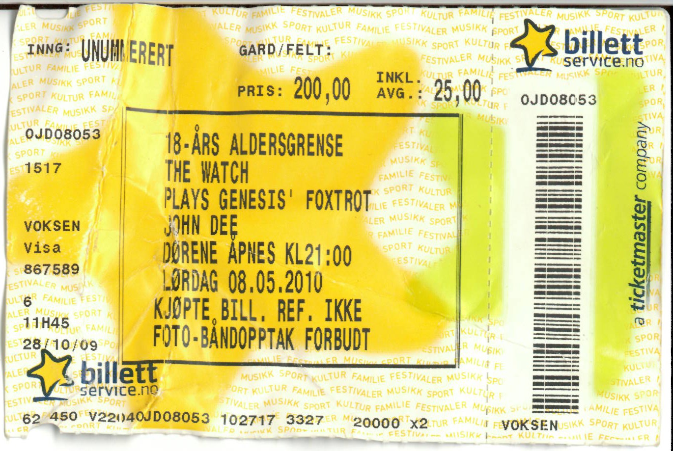 | 08.05.2010 | The Watch | Plays Genesis' Foxtrot | John Dee | Ticket | jjvdgeer | ||