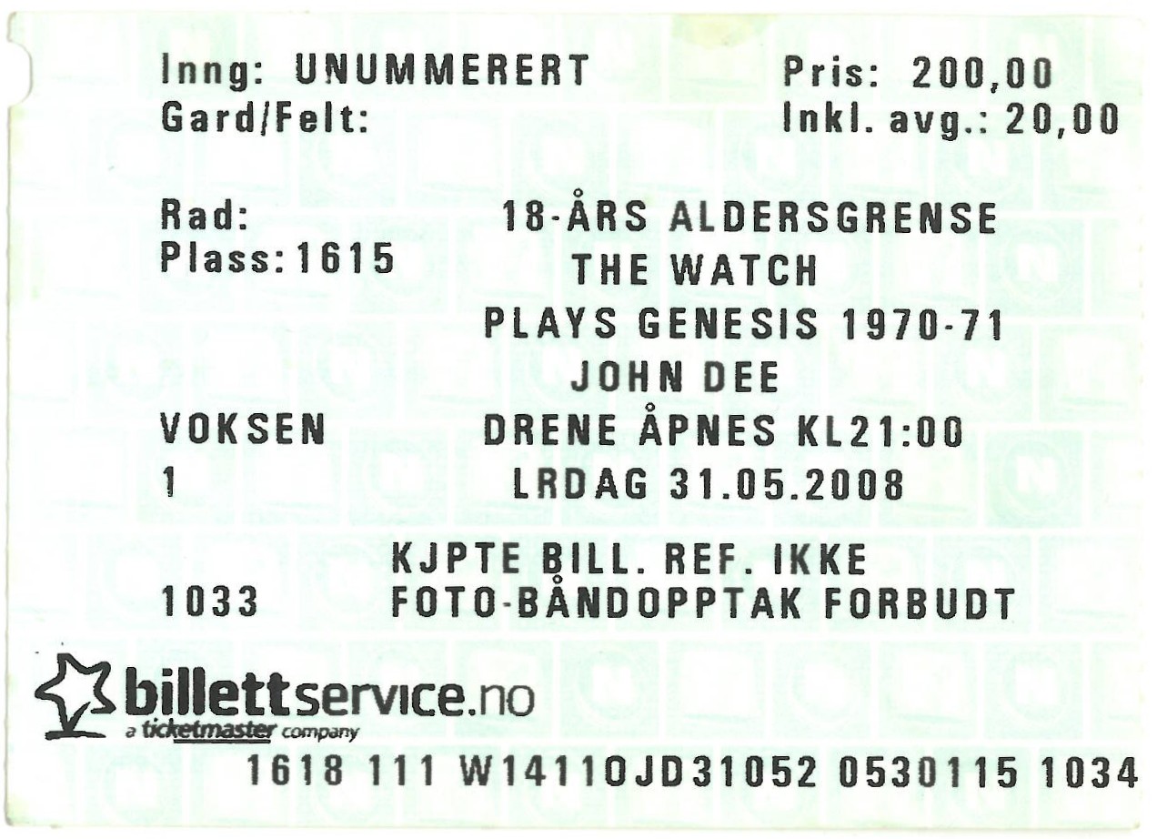 | 31.05.2008 | The Watch | Plays Genesis 1970-71 | John Dee | Ticket | jjvdgeer | ||